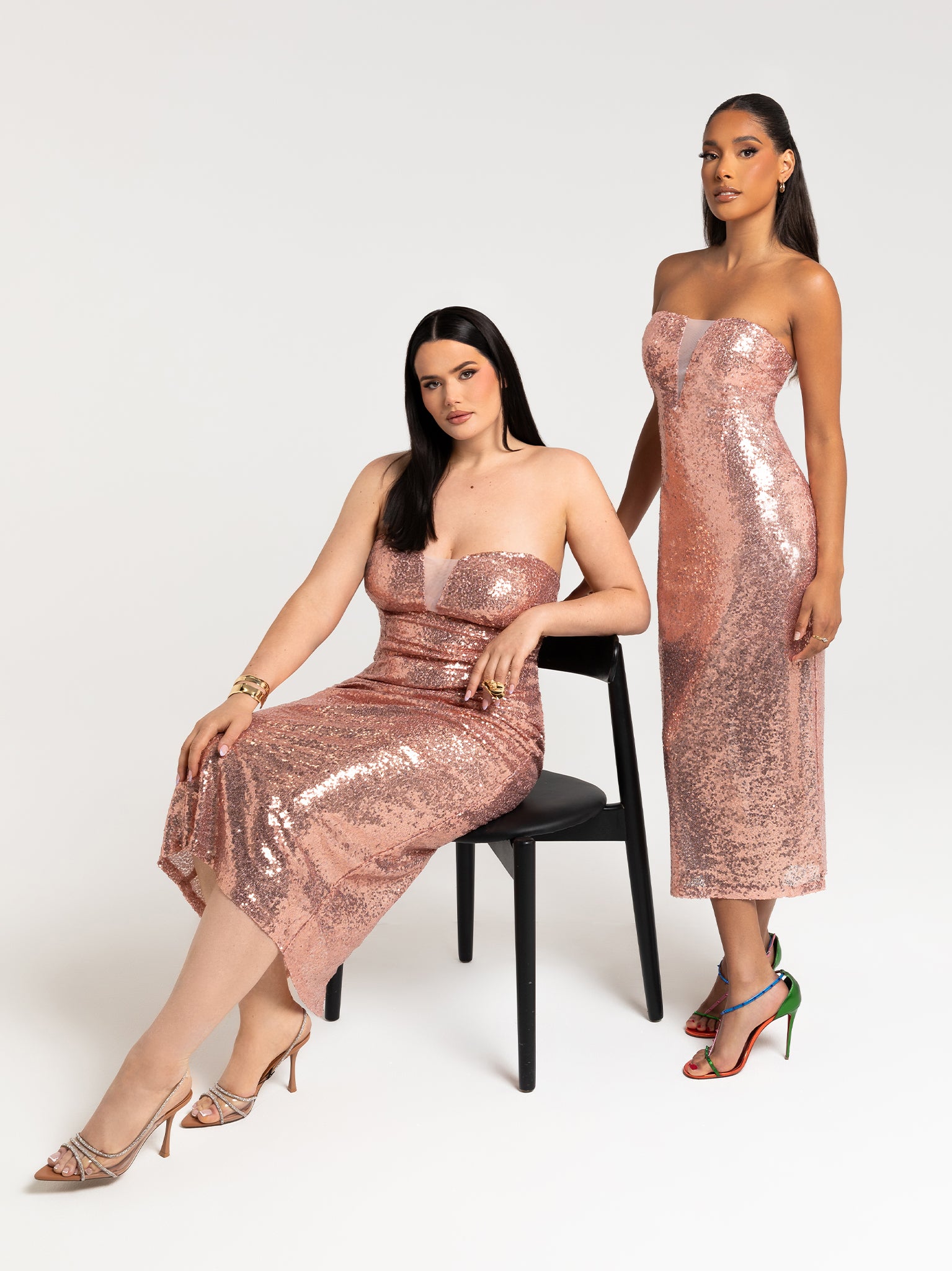 The Denise Midi Dress. Crafted from stretchy sequin fabric, this dress offers a captivating, figure-hugging silhouette that exudes modern elegance. it’s designed for a shimmering, flattering fit.